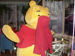 Caleb couldn't stand it any longer...He went to the breakfast area infront of us and took Pooh by the hand and lead him over to us. Pooh was definatly Caleb's favorite character! Pooh Bear gave hugs all around. He definatly was and is a cuddly old bear! Caleb had a hard time letting go of Pooh's hand. This bear was a good sport! He entertained while we ate some of our breakfast. He saw Zach's coat on the back of a chair and brought it next to his shirt to show that they were the same color and then put it on his nose and head. The kids were cracking up! What great entertainment! Pooh didn't stop with the coat...he started bopping the kids on the head with their balloons. Jessie couldn't contain her laughter. What fun memories they'll have! A hug for tigger! Eiyore was very cuddle too! Caleb just petted him. Tanner wasn't sure if he wanted to turn his back on this grey creature and watched him like a hawk. Zach just snuggled up close...Eiyore was fuzzy and warm!Zach got a small stuffed animal Eiyore for one of his surprises. This is a cuter picture though! Caleb didn't know what this animal was,but he looked like a dog of horse so he just pet him again. Here's the girls taking time for a quick picture and then back to breakfast again. Tigger was just as playful as you would expect...teasing Zach with his hood! He did get down to give Caleb a hug though. He did a little dance with the girls. They thought that was pretty cool! Then he tried to sneak up on Caleb when he went back to his food...this got a good laugh from the other kids.